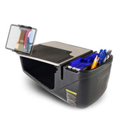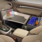 The GripMaster Efficiency Car Desk serves as the foundation, fitting into the passenger seat of most cars and trucks and securing firmly with the seatbelt. Its flat, non-skid rubber surface provides a reliable area for writing, laptop use, or tablet interaction while parked.