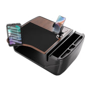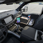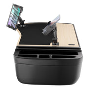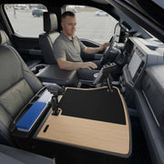 The GripMaster Efficiency Car Desk serves as the foundation, fitting securely into the passenger seat of most cars and trucks. Its flat, non-skid rubber work surface provides a reliable area for writing, laptop use, or tablet interaction while parked.