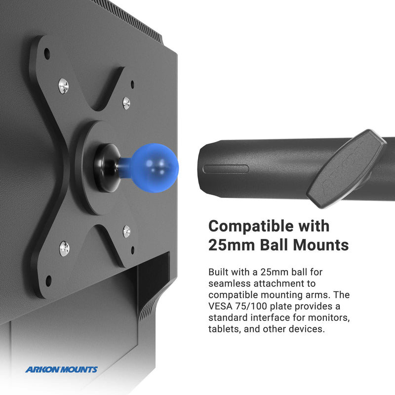 The VESA 75 / VESA 100 to 25mm Ball Mount Bracket Adapter bridges between a VESA-compatible flat panel monitor, TV, or display and a 25mm Arkon robust or other third-party mounting stand. It supports VESA 75 (75mm x 75mm) and VESA 100 (100mm x 100mm) patterns, ensuring it fits various display sizes and setups. Please note that mounts, holders, and devices are available separately.
